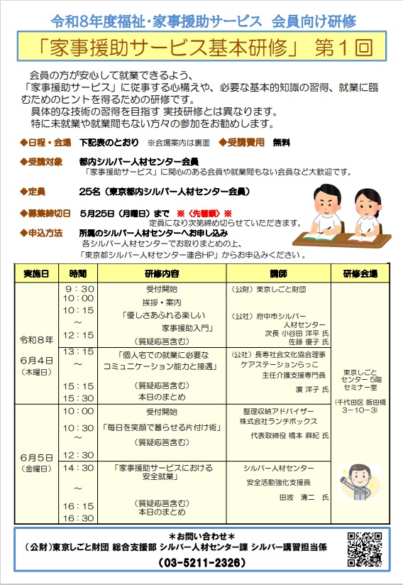 会員向け研修「令和8年度家事援助サービス基本研修 第1回」の募集を開始しました